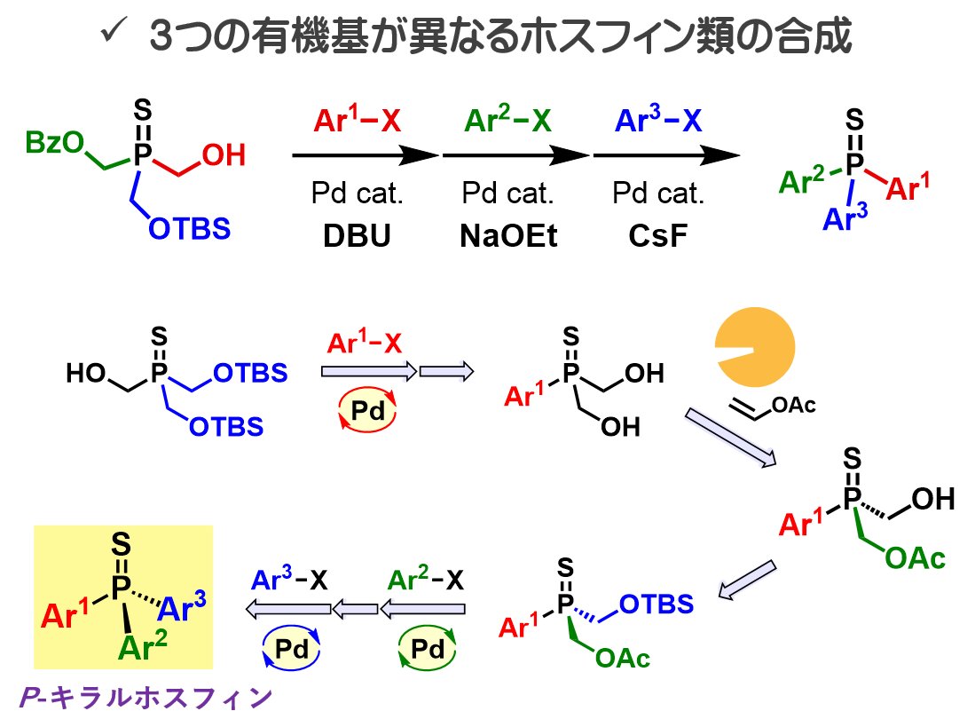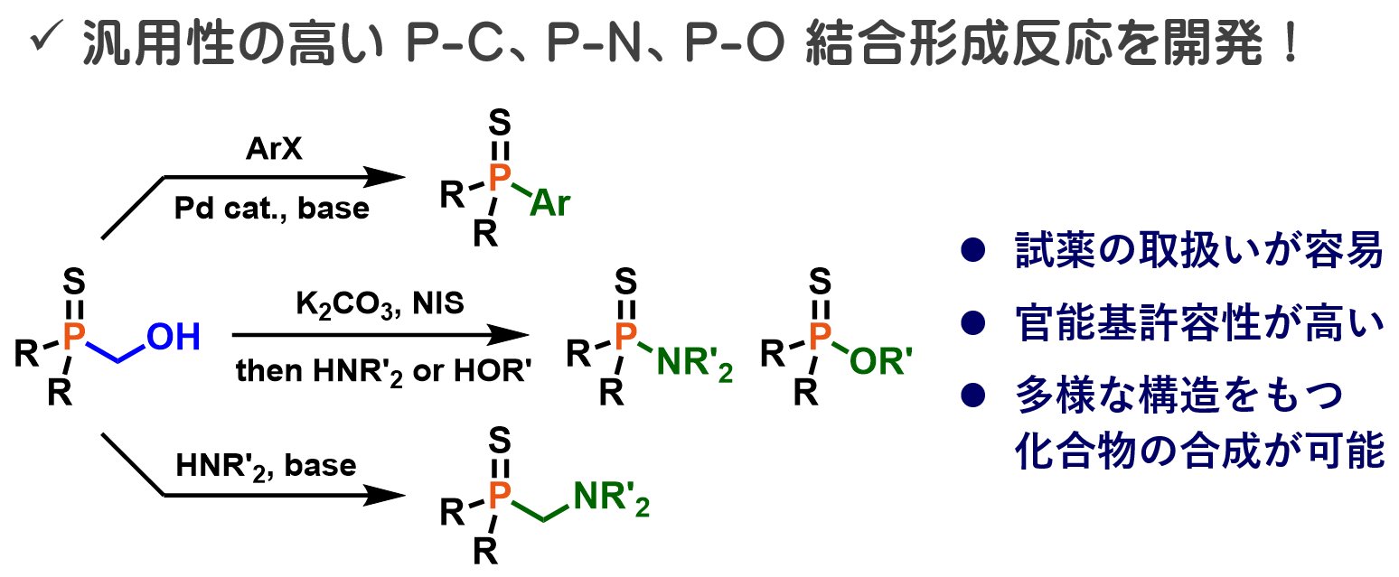 有機リン化合物は、医薬・農薬・機能性材料・触媒など、多くの分野で重要な役割を担っています。しかし、その合成方法は限られており、研究当初、私たちが設計した分子を合成することができませんでした。そこで、望みの構造をもつ有機リン化合物を 「自由自在」 に合成するための様々な反応を開発しています。