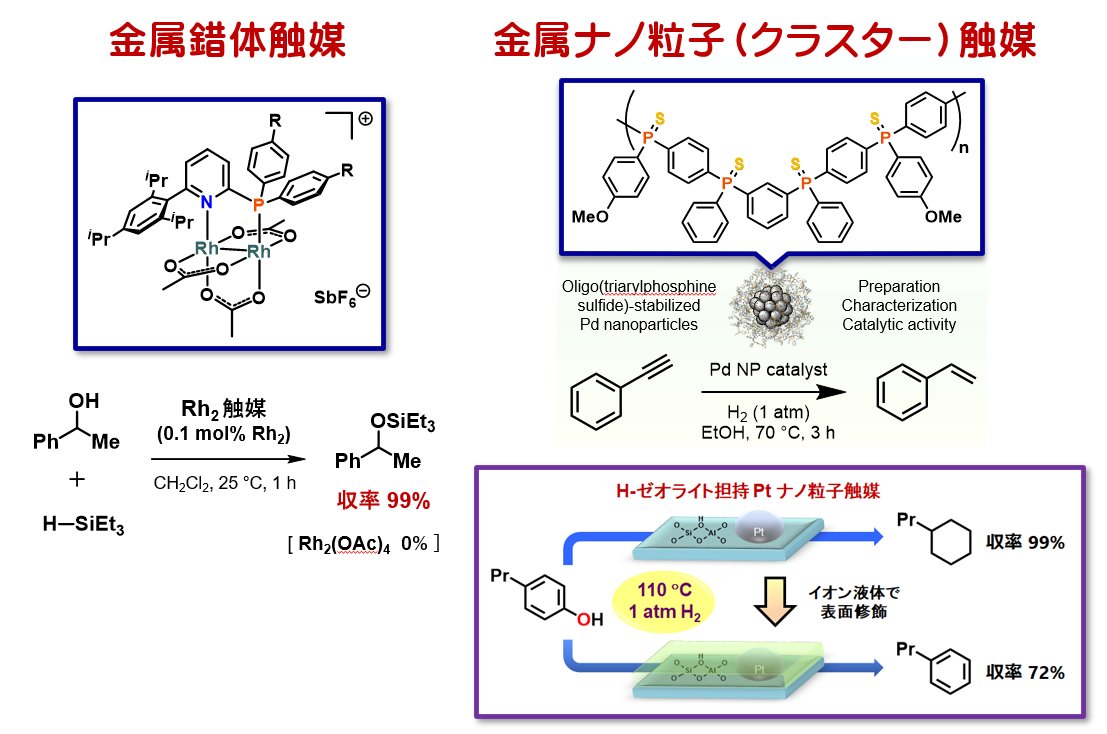 効率的な有機合成を目指すために、高性能な触媒の開発を行っています。私たちが開発の対象としているのは『金属触媒』です。金属の周りの環境が触媒性能(反応性・選択性)に大きく影響するため、「その環境をいかに作るか」という観点から様々なアプローチで研究を進めています。当研究室の面白いところは、多くの有機化学(有機金属化学)の研究室で行われている『金属錯体触媒』はもちろんのこと、無機化学系の研究室が得意とする『担持金属ナノ粒子触媒』や『有機保護金属ナノ粒子触媒』の開発も行っていることです。
