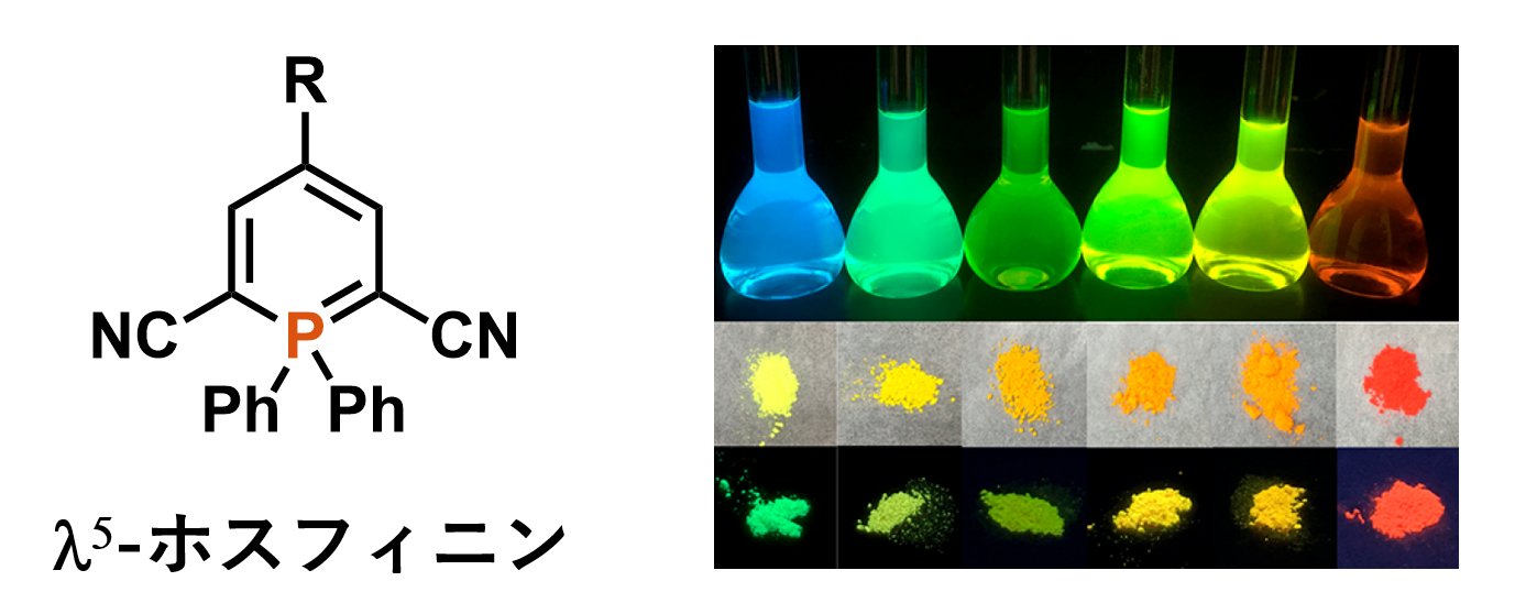 私たちは、実験中に良く光る有機リン化合物を偶然見つけました。最初は極めて少量しか採れず、構造も全くわからない謎の化合物でしたが、分析により構造を決定し、反応を改良することで、今では『様々な色に光る新しい有機蛍光材料』を大量に合成できるようになりました。学術的な基礎研究から実用化を目指した応用研究まで、当研究室のメインテーマの一つとして、精力的に研究を行っています。